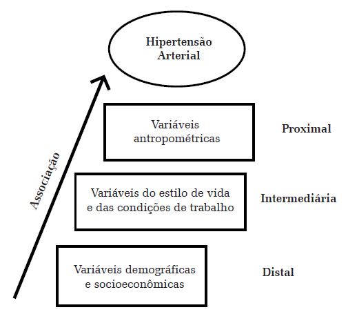 Por fim, as associações independentes da demanda-controle e das demais covariáveis com a HA foram avaliadas por meio da regressão de Poisson com variâncias robustas, com base em um modelo conceitual hierarquizado adaptado de Da Costa et al16. Em tal modelo (Figura 1) são dispostos três blocos de variáveis: 1) demográficas, socioeconômica (distal); 2) estilo de vida, condições de trabalho (intermediário); 3) antropométrica (proximal). As RP e seus respectivos IC de 95% foram ajustados pelas variáveis do mesmo bloco ou por aquelas de blocos superiores quando os valores de significância estatística na análise bivariada foram inferiores a 20% (p < 0,20). Nessa etapa também foram calculados os valores de p de tendência linear para variáveis qualitativas ordinais. Ao final, o nível de significância estatística fixado foi de alfa = 5%.