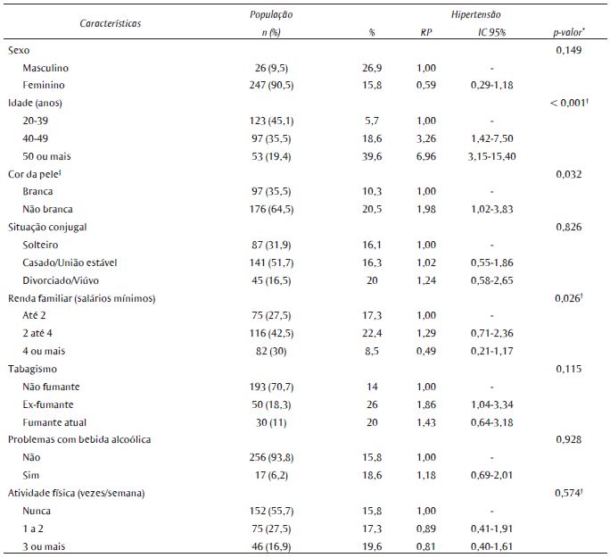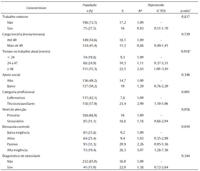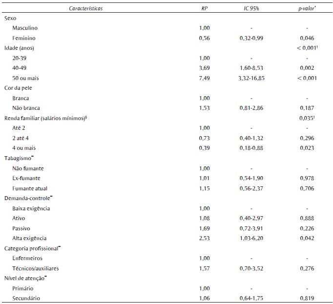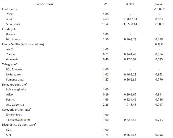 Resultados: dos profissionais estudados, 42,1% eram enfermeiros e 57,8%, técnicos ou auxiliares de enfermagem. A HA foi diagnosticada em 16,9%. Sexo feminino (RP = 0,56), avançar da idade (p de tendência linear < 0,001), renda familiar de 4 ou mais salários mínimos (RP = 0,39) e o estresse no trabalho (RP = 2,53) permaneceram independentemente associadas à HA após o ajuste multivariado dos dados.