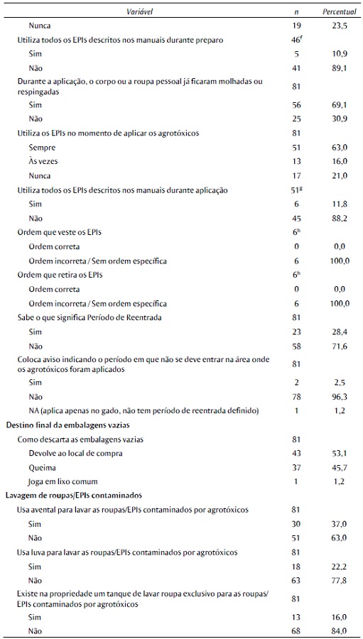 A Tabela 2 apresenta os dados referentes às práticas de trabalho relacionadas ao uso de agrotóxicos entre os agricultores familiares de Lavras. Os resultados mais relevantes são analisados na discussão deste trabalho.