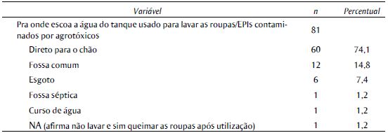 Segundo os manuais de "uso seguro", o local de realização da atividade não só deveria ser distante da residência e da circulação de pessoas desprotegidas como também deveria ser em tanques de utilização exclusiva para roupas contaminadas por agrotóxicos, contendo encanamento destinado para fossa séptica de tratamento de resíduos químicos. Estas exigências, que não levam em consideração o contexto econômico e estrutural da agricultura familiar, não são observadas nas unidades produtivas visitadas para a realização deste trabalho (Tabela 2). Nestes casos, a inexistência de tanque exclusivo para as roupas e EPIs contaminados corresponde à exposição das roupas pessoais a resíduos de agrotóxicos e o despejo da água contaminada em locais que não as fossas sépticas corresponde à contaminação direta das pessoas, animais, solo, lençóis freáticos e fluxos de água.