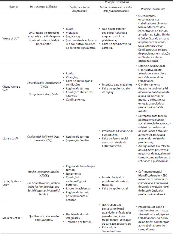 Nesta revisão, os estudos identificaram que a indústria de petróleo está relacionada a diversas fontes de estresse ocupacional (regime de turnos, sobrecarga de trabalho, confinamento e regime de embarque nas plataformas, ruído, vibração, barulho etc.) associadas a alguns fatores psicossociais, como uso de álcool e drogas, distúrbios de sono, dificuldade de memória, depressão, falta de apoio social e dificuldades nos relacionamentos interpessoais.