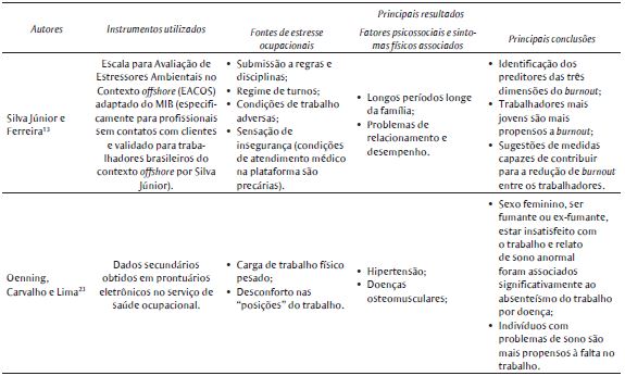 Foram encontrados somente dois estudos sobre a ocorrência da síndrome de burnout nos trabalhadores da indústria do petróleo, um estrangeiro (da Noruega) de Hellesoy et al.4 e outro nacional, conduzido por Silva Júnior e Ferreira13. Entretanto, todos se referiam à relação entre o espaço de trabalho na indústria de petróleo e as consequências do estresse ocupacional na saúde do trabalhador.