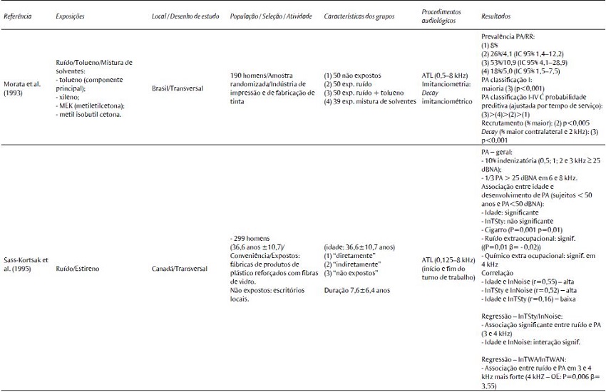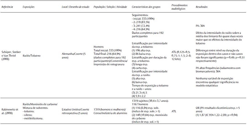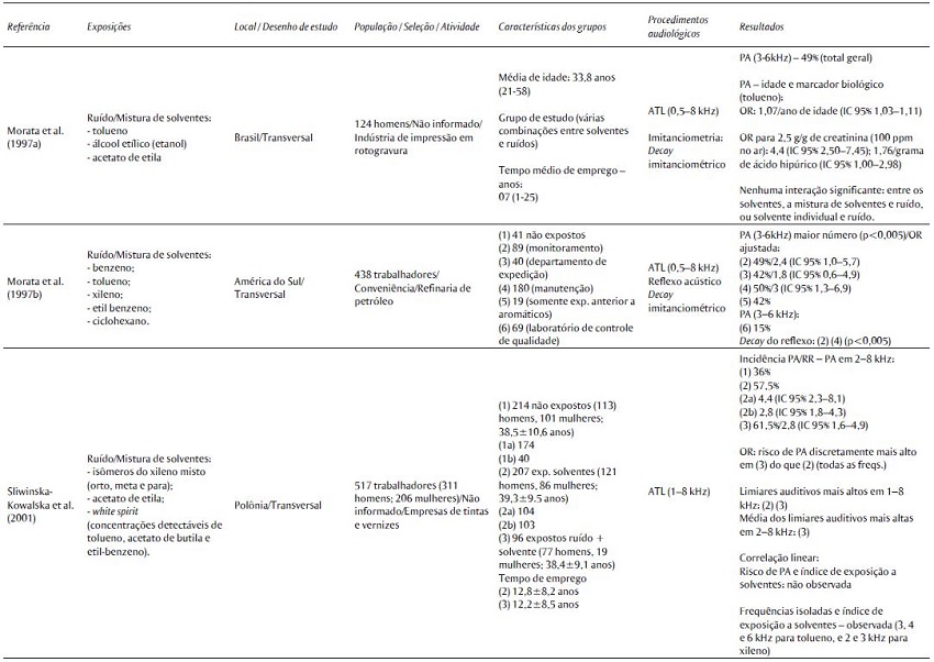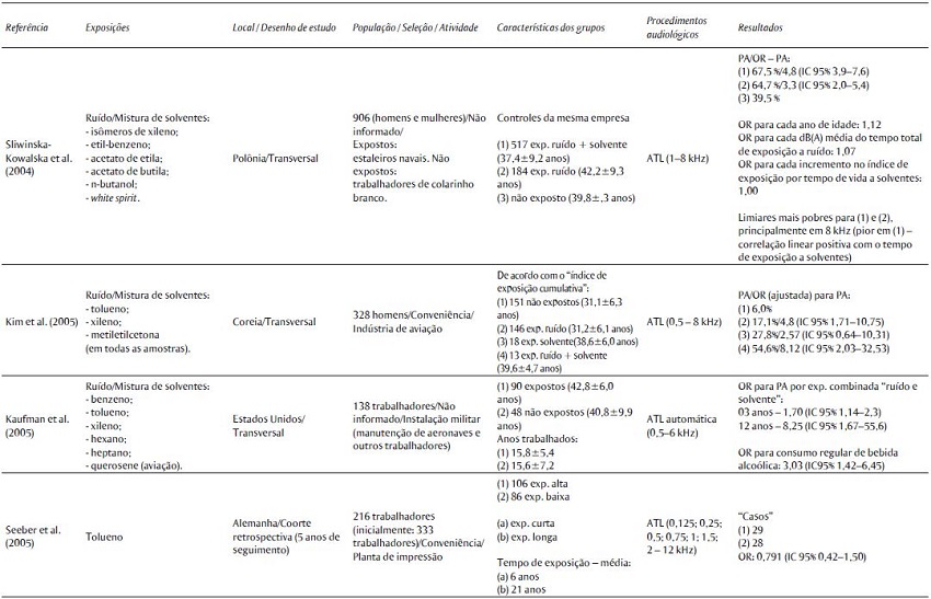 Mediante a complexidade das exposições, grupos homogêneos de exposição à mistura de solventes com comparabilidade entre si foram escassos. Observaram-se diferenças entre as caracterizações das exposições, o período de coleta de dados e seguimento, os procedimentos de avaliação auditiva e na definição dos desfechos, bem como nas análises dos dados obtidos em cada estudo. O nível da exposição à mistura de solventes, dentro ou fora dos limites permitidos, foi considerado, a fim de facilitar a análise dos estudos.