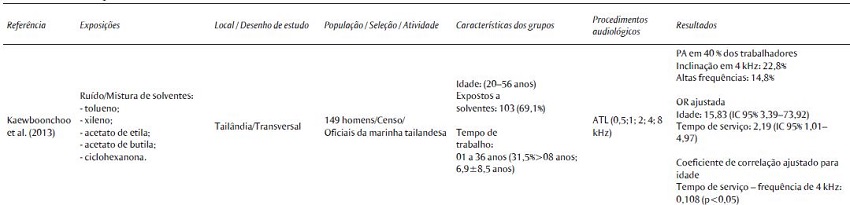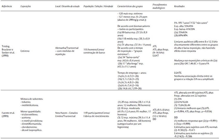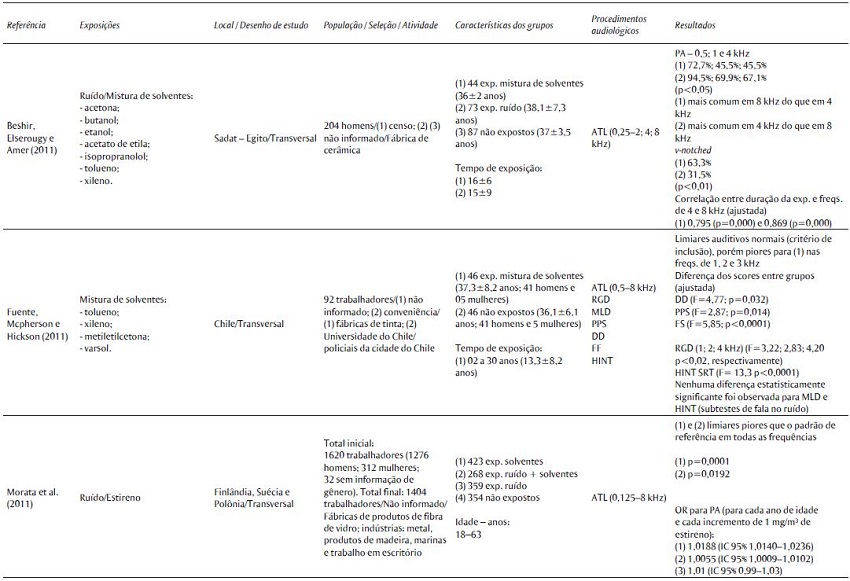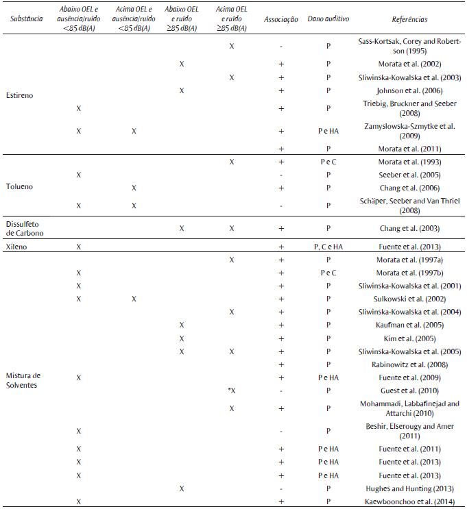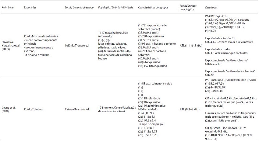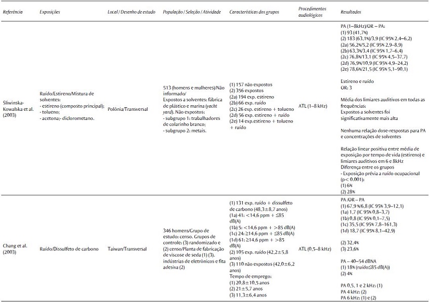 A exposição à mistura de solventes esteve presente em 21 estudos, associada ou não ao ruído, sendo o tolueno (17 estudos) e o xileno (16 estudos) os solventes de maior frequência entre as misturas. Os compostos encontrados nas exposições isoladas foram o estireno (7 estudos), o tolueno (4 estudos) e o dissulfeto de carbono (1 estudo) (Tabela 1).