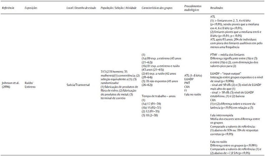 Em um estudo multicêntrico conduzido na Suécia, Finlândia e Polônia(24), a exposição a estireno esteve associada a piores limiares auditivos à ATL, sendo confirmada associação entre PA e a exposição combinada a estireno e ruído. Os dados indicaram interação estatisticamente significante entre ruído e estireno na geração de PAO. Todavia, a falta de informações completas sobre o histórico de exposições e outros parâmetros relevantes impossibilitou a identificação precisa da contribuição de cada agente no desencadeamento do dano auditivo. Os autores ainda consideram imprópria qualquer tentativa de calcular o efeito dose-resposta ou definir limites seguros relacionados à audição para exposições a estireno, a partir dos dados obtidos no estudo.