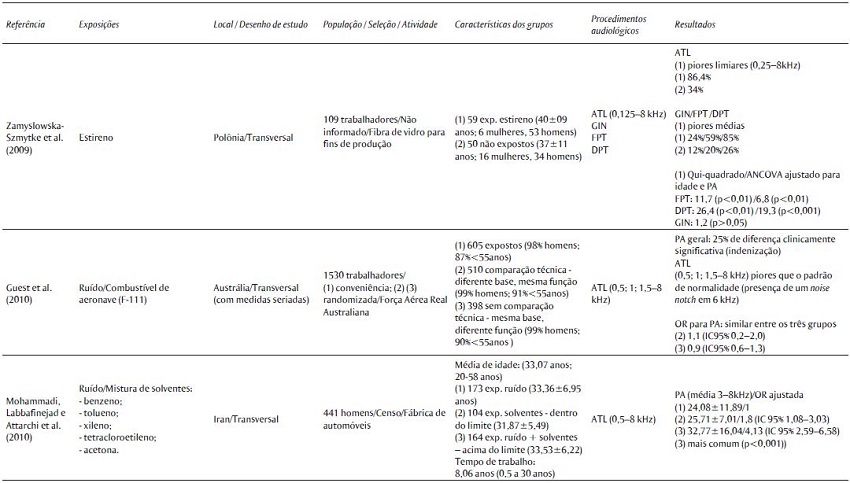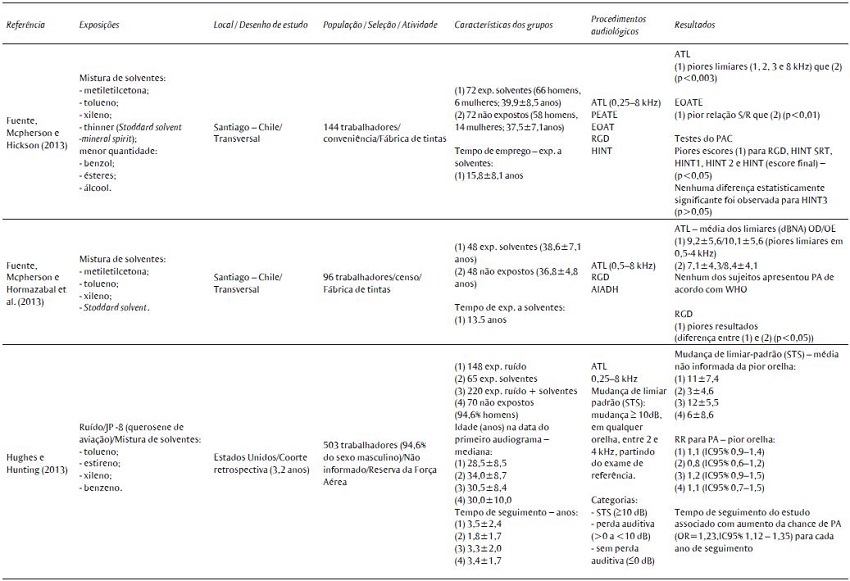 Discussão: os estudos confirmaram a exposição a determinados solventes como fator de risco para perda auditiva de origem ocupacional, sobretudo na presença do ruído. Foram utilizados métodos variados de avaliação e classificação do desfecho coclear e/ou central, que contribuíram para a compreensão da extensão da perda auditiva induzida quimicamente, bem como com a identificação dos grupos populacionais susceptíveis. Contudo, dados sobre procedimentos diagnósticos adequados, níveis seguros e efeito dose-resposta da exposição química ainda não foram totalmente elucidados.