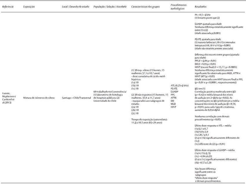 Os efeitos da exposição nos limiares e extensão de frequências audiométricas, bem como nas respostas eletrofisiológicas e nos escores dos procedimentos de avaliação do PAC apresentaram diferença entre expostos e não expostos a compostos químicos. Esses parâmetros de avaliação da audição não apresentaram variações relevantes entre os tipos de exposição: isolada a um determinado solvente ou exposições à mistura de solventes. Contudo, a prevalência ou a chance/risco de desenvolver PAO foi maior entre indivíduos expostos à combinação "solvente(s) e ruído"10-12),(20),(28),(31-33),(40 e a combinação "ruído e dois solventes"11),(13.