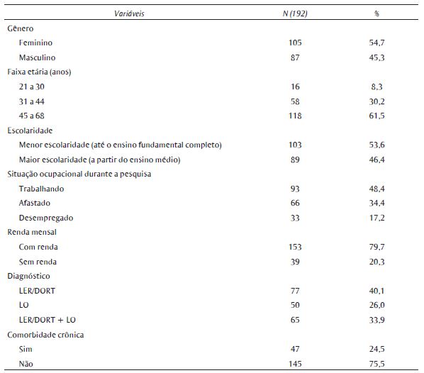 Do total de 394 trabalhadores com LER/DORT e/ ou LO matriculados no Cerest Regional de Guarulhos no período de janeiro de 2011 a março de 2013, 89 não puderam ser contatados por motivo de alterações cadastrais; 107 não puderam ou não consentiram participar da pesquisa; e 6 foram excluídos por apresentarem dificuldade de compreensão para responder aos questionários, o que resultaria em respostas imprecisas e pouco confiáveis. A amostra não probabilística foi, então, composta por 192 trabalhadores (48,73% do total), com média de idade de 46,17 ± 9,65 anos, ressaltando-se que o perfil dos respondentes em relação ao gênero, faixa etária e diagnóstico não diferiu dos não respondentes (p>0,05).