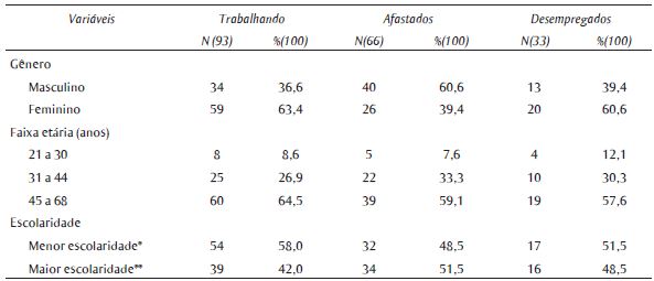 Em relação à situação ocupacional atual, realizou-se uma subdivisão, considerando-se os sujeitos que estavam trabalhando, aqueles que estavam afastados de suas atividades profissionais (incluindo-se os trabalhadores aposentados ou afastados pela previdência social) e os desempregados.