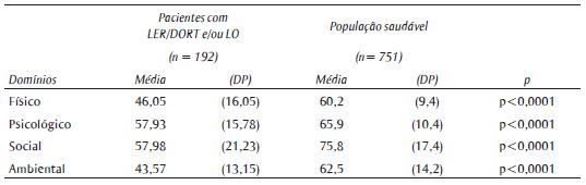 De maneira geral, as médias de todos os domínios do WHOQOL-Breve na população com diagnóstico de LER/DORT e/ou LO foram significantemente menores do que os valores encontrados para a população saudável. As menores pontuações encontram-se nos domínios físico e ambiental.