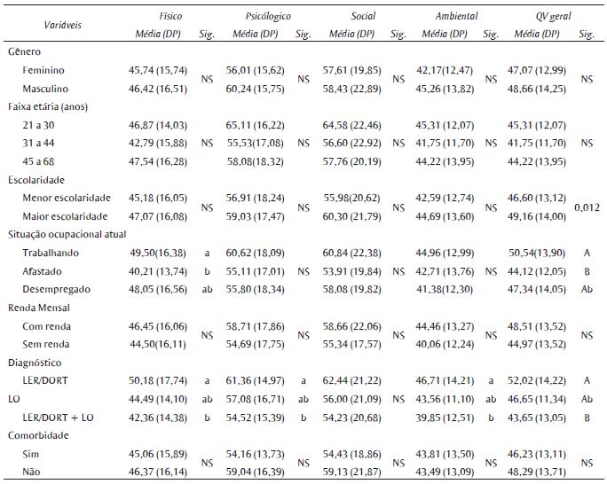A Tabela 4 mostra as médias e os desvios padrão dos escores de todos os domínios do WHOQOL-Breve e da qualidade de vida geral na amostra de trabalhadores com LER/DORT e/ou LO, estratificados por gênero, faixa etária, escolaridade, situação ocupacional atual, renda mensal, presença de comorbidades crônicas associadas e diagnóstico principal. Com relação ao diagnóstico, foram adotados os mesmos três subgrupos já mencionados: LER/DORT, lombalgia, LER/ DORT+lombalgia.