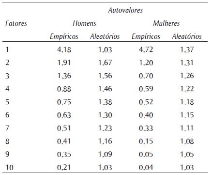 O resultado na amostra de mulheres levanta o pressuposto da unidimensionalidade do instrumento quando aplicado na população feminina, ao considerar que todos os itens estejam medindo um único constructo.