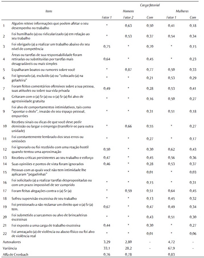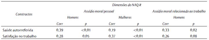 Resultados: duas dimensões, ou variáveis latentes, foram identificadas: assédio moral pessoal e assédio moral relacionado ao trabalho. A dimensão assédio moral relacionado ao trabalho esteve correlacionada, entre os homens, com saúde autorreferida (rho=0,33; p=0,02). A mesma situação com o assédio moral pessoal, que apresentou correlação com saúde autorreferida entre os homens (rho=0,39; p<0,01) e satisfação no trabalho (rho=0,28; p=0,05). Entre as mulheres, a única dimensão encontrada compatível com assédio moral pessoal correlacionou-se com satisfação no trabalho (rho=0,37; p<0,01) e saúde autorreferida (rho=0,19; p<0,01).