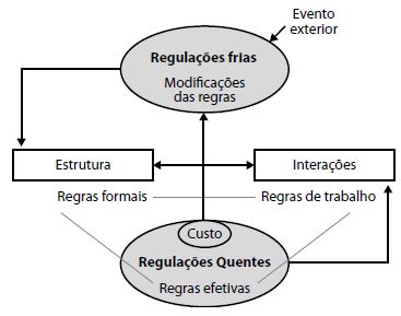 O grande desafio no mundo do trabalho é conseguir articular estes dois aspectos, o formal e o vivo. Segundo Carballeda11, há duas formas possíveis de favorecer essa articulação. A primeira remete à negociação no campo (ou à produção de regras efetivas) entre os operadores e os seus supervisores, quando, por exemplo, estes últimos concordam que os operadores violem alguma regra formal (normalmente inadaptada ao campo), para que a produção continue a ocorrer. Trata-se de uma “regulação quente”, ou regulações desenvolvidas entre os trabalhadores operacionais durante a atividade de trabalho e em função dos imprevistos nela ocorridos. Contudo, a sua execução pode gerar um custo cognitivo e organizacional importante para aqueles que a executam. Isso ocorre, por exemplo, quando algumas regras, frequentemente desconectadas da realidade, devem ser regularmente infringidas pelos trabalhadores para que as taxas produtivas se mantenham. Nesse caso, ou por necessidade de um evento exterior (como a obrigação de implantação de uma nova norma ou lei), uma segunda forma de regulação consiste em modificar as regras formais existentes ou produzir novas regras, mais adaptadas à realidade das situações de trabalho. Esse tipo de regulação, denominado de “regulação fria”, é aquela desenvolvida pelos gestores fora da situação de trabalho, com o intuito de modificar as regras existentes do campo operacional. A Figura 1 ilustra de forma esquematizada a produção de regulações quentes e frias em um coletivo de trabalho.