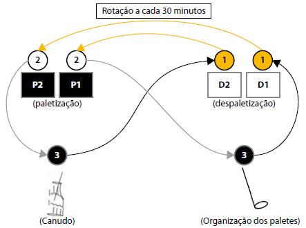 A empresa impõe um rodízio prescrito ao grupo, que ocorre da seguinte maneira: a cada 30 minutos, a dupla 1 avança em direção à dupla 2; a dupla 2 se separa, um deles indo para o posto de retirada do canudo, e o outro para a organização dos paletes; a dupla 3 avança para a paletização manual. A Figura 2 ilustra a rotação prescrita pela empresa.