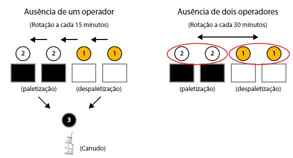 Em geral, os operadores da paletização dividem os engradados que chegam pela linha, de maneira que cada um deles pegue dois engradados para montar o próprio palete. Contudo, um acordo pode ser feito pela dupla, de modo que somente um entre eles se responsabilize por todos os engradados que chegam pela esteira, enquanto o outro descansa. Quando o palete é finalizado, os assistentes invertem a situação, de modo que aquele que montou o palete entre na pausa e aquele que estava na pausa monte o novo palete.