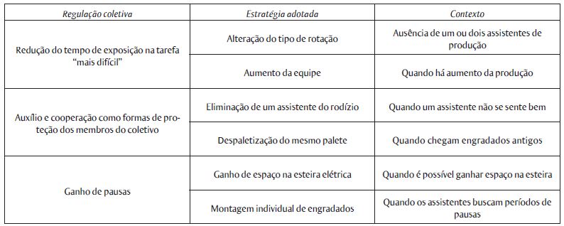 Os primeiros resultados dessa pesquisa revelam tipos de rotação muito frequentemente diferentes daqueles prescritos pela empresa e um conjunto considerável de regulações executadas na situação de trabalho, por meio de estratégias coletivas, para tentar gerir uma parte da carga de trabalho a que os trabalhadores estão expostos. O Quadro 1 apresenta uma classificação de todas as regulações desenvolvidas pelos assistentes de produção, assim como as estratégias adotadas e o contexto de cada uma delas.