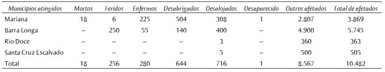 O vazamento de 60 milhões m³ de lama de rejeitos desabrigou mais de 1.200 pessoas e matou 18, além de deixar um desaparecido, trabalhador da Samarco, cujo corpo não foi encontrado. Dos mortos, 13 eram trabalhadores terceirizados, e apenas um funcionário da própria Samarco. Essa realidade expressa a prática de precarização do trabalho com a contratação de empresas terceiras para atividades de maior risco1. Cinco outros mortos eram duas crianças, de 5 e 7 anos, e três adultos entre 60 e 73 anos. O número de mortos, feridos, enfermos, desabrigados, desalojados, desaparecidos foi estimado, sendo apresentado na Tabela 1.