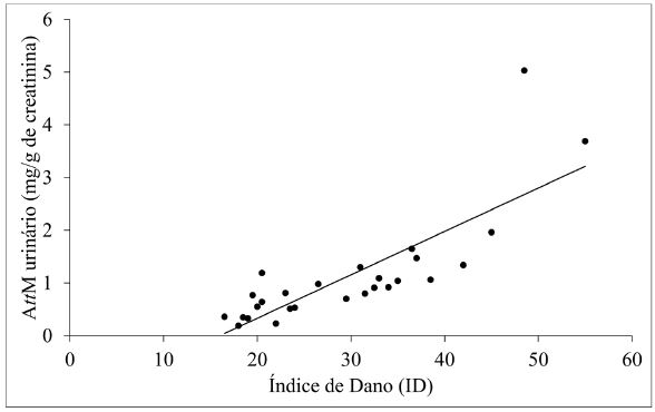 Resultados: o Teste Cometa mostrou uma média (desvio padrão) de índice de dano, expresso em unidades arbitrárias, no grupo exposto de 28,4 (10,1) significativamente mais elevado do que no grupo não-exposto, 18,4 (10,1). O AttM urinário, em mg/g de creatinina, foi significativamente maior no grupo exposto, 1,13 (0,45), em relação ao grupo não exposto, 0,44 (0,33). Os dois biomarcadores apresentaram boa correlação linear (r=0,81; p<0,05), indicando uma forte associação entre o biomarcador de exposição e o biomarcador de efeito.