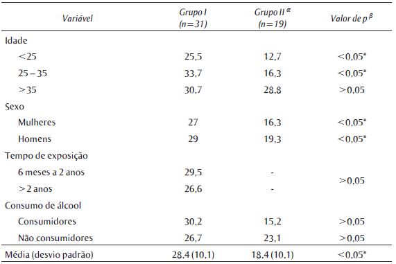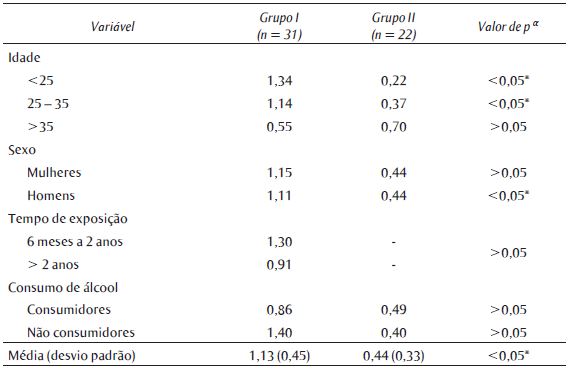 O resultado do Teste Cometa para os Grupos I e II é mostrado na Tabela 1. Os valores desse biomarcador são expressos pelo Índice de Dano (ID) e mostraram diferenças significativas (p < 0,05) entre os dois grupos. Os resultados das análises em relação aos fatores individuais, como sexo e idade, mostraram diferenças entre os grupos, com exceção para a categoria de idade com mais de 35 anos, cuja diferença não foi observada. O consumo de álcool entre os grupos e o tempo de exposição dentro do Grupo I não foram variáveis significativamente diferentes.