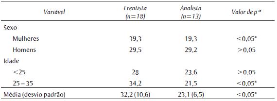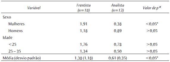 Em relação ao tipo de profissão, verificou-se um aumento do ID em frentistas quando comparado aos analistas de combustíveis, cujos resultados são apresentados na Tabela 2. Também foram observadas diferenças significativas nos valores de ID entre frentistas e analistas, relacionados ao gênero e idade entre 25 a 35 anos.