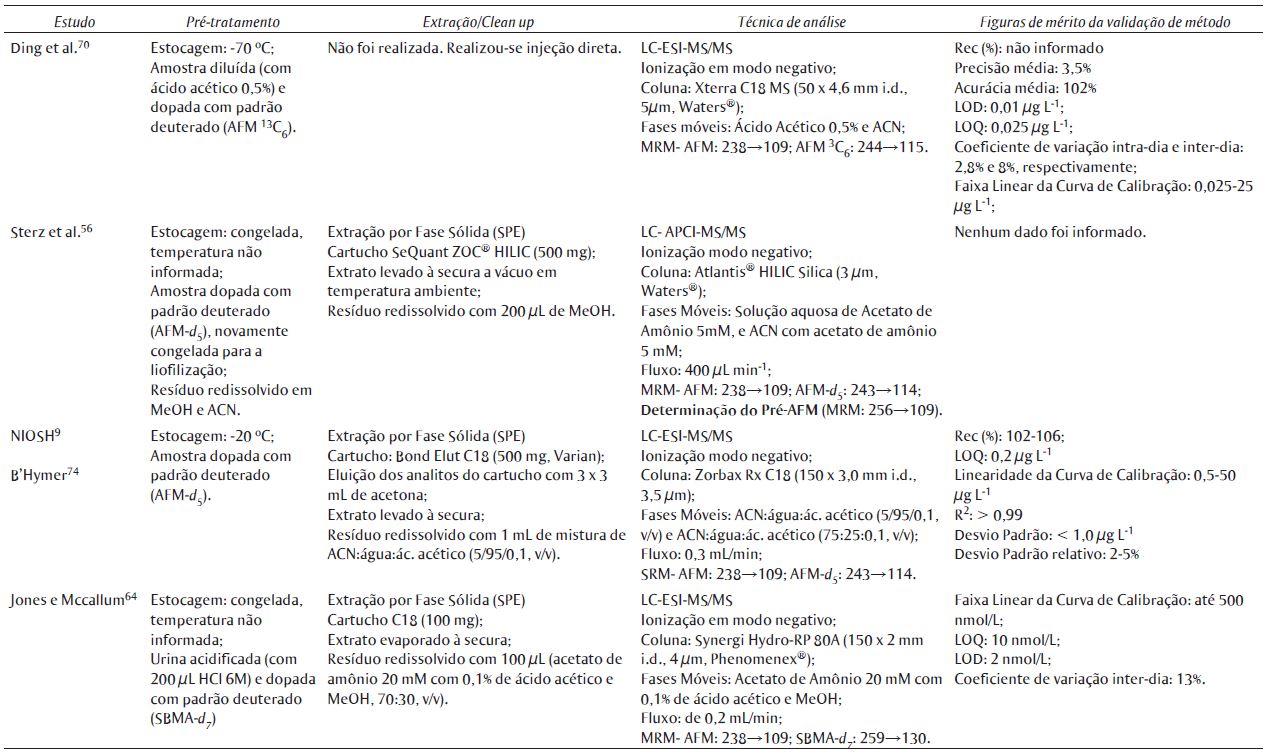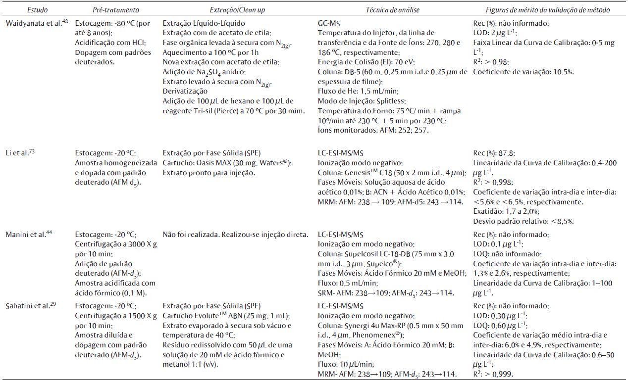 Diferentes métodos têm sido propostos para determinação do AFM urinário em estudos direcionados à avaliação da exposição humana (ambiental e/ou ocupacional) ao benzeno e seus impactos à saúde8), (36)- (40. Alguns estudos considerados relevantes sob o ponto de vista analítico foram compilados neste trabalho, e alguns dos procedimentos utilizados são apresentados na Tabela 1.