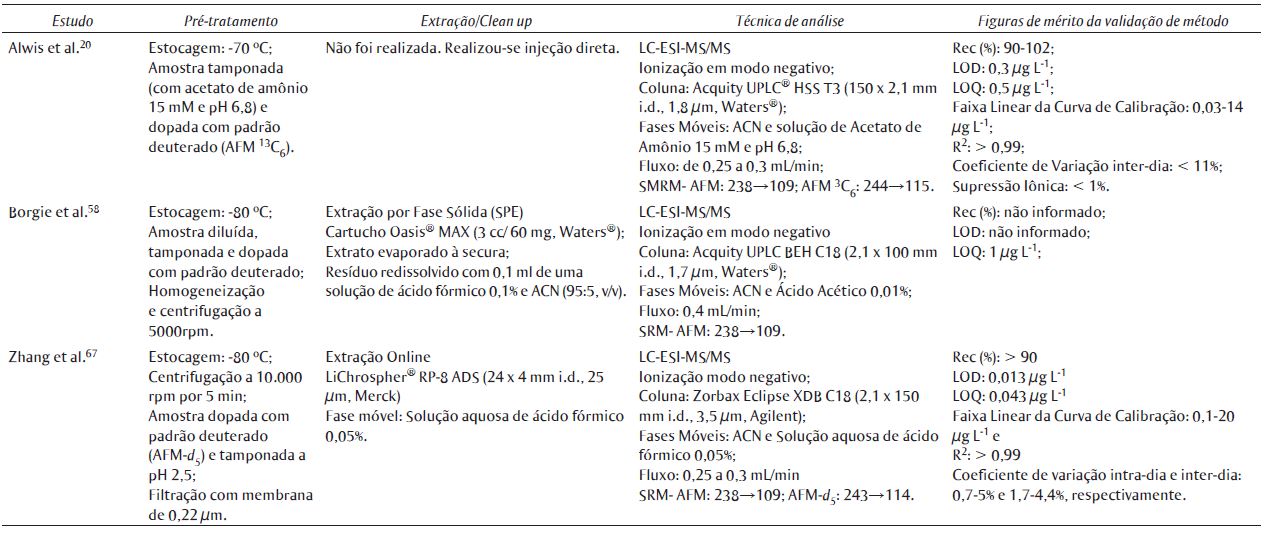 | Amostra homogeneizada e dopada com padrão deuterado (AFM d5). | Cartucho: Oasis MAX (30 mg, Waters®); | Ionização modo negativo; | Linearidade da Curva de Calibração: 0,4-200 µg L-1. | |