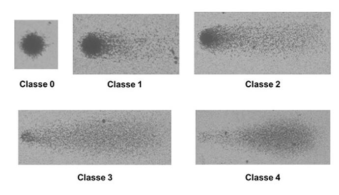 A etapa final do teste de SCGE é a avaliação do grau de migração do DNA visualizado nos cometas presentes nas lâminas, sendo essa migração classificada em categorias (0, 1, 2, 3 e 4), de acordo com o tamanho do nucleoide e da cauda formados, como apresentado na Figura 1. O grau de migração do DNA pode ser expresso em unidades arbitrárias (UA), porcentagem de células com dano (%), comprimento da cauda (tail length), intensidade da cabeça (head intensity), intensidade da cauda (tail intensity), momento da cauda (tail moment) e razão entre o comprimento da cauda e o diâmetro da cabeça/nucleoide. Em análises por visual score, são avaliadas duas lâminas por amostragem, sendo lidos 50 nucleoides por lâmina, completando um total de 100 células avaliadas para cada amostra. Os resultados desse tipo de análise são expressos em unidades arbitrárias (UA), que corresponde à soma ponderada dos cometas lidos, ou em porcentagem de dano (%). Já o comprimento da cauda e o momento de cauda também são usados como medidas da extensão de dano no DNA, onde as células são analisadas em software26), (28), (29.