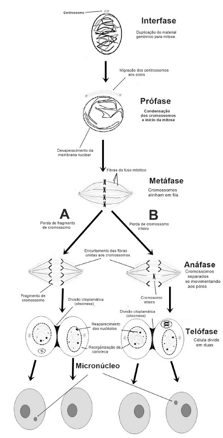 O micronúcleo é um tipo de dano cromossômico ou anomalia mitótica que tem sua origem a partir de fragmentos de cromossomos ou cromossomos inteiros. Durante a fase da anáfase da mitose eles não são capazes de interagir com o eixo formado na citocinese e, portanto, não são incorporados aos núcleos filhos (Figura 2) (42), (43. Os micronúcleos podem ser analisados em células tratadas ou não com bloqueio do processo de citocinese.