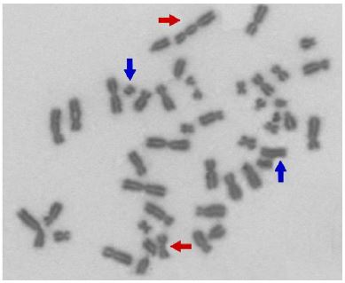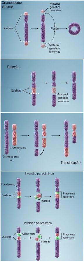No processo de deleção ocorre a perda de um fragmento do cromossomo. Deleções podem ser terminais, quando o cromossomo perde o final de um de seus braços, ou intersticiais, quando a deleção ocorre no meio do braço e a parte terminal deste se une a ele. A formação de anéis ocorre quando um cromossomo perde suas terminações dos braços p (braço curto) ou q (braço longo), com posterior junção de seus braços. A translocação é o processo de transferência de um fragmento do cromossomo para outro, não homólogo, enquanto na inversão um fragmento do cromossomo é formado e realocado no mesmo cromossomo, mas invertido. Uma inversão pode ser pericêntrica, incluindo seu centrômero no fragmento invertido, ou paracêntrica, quando o centrômero não está incluído no fragmento invertido. Na análise visual do cariótipo, como nos testes de aberrações cromossômicas, as inversões e translocações só são visíveis caso a forma dos cromossomos difira substancialmente da configuração normal. Entretanto, quebras e formações de anéis são visíveis em microscópio óptico74, como mostra a visualização de uma amostra na Figura 4.