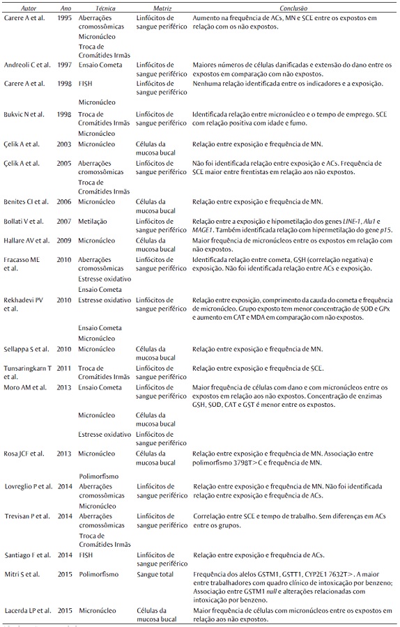Os principais ensaios de avaliação de genotoxicidade descritos na literatura e empregados na avaliação de exposições ocupacionais e ambientais, como é o caso da exposição ao benzeno e vapores em postos de gasolina, são: ensaio cometa, micronúcleo, aberrações cromossômicas e formação de adutos, que, em conjunto com os ensaios utilizados para avaliação de indicadores de estresse oxidativo e polimorfismos, permitem avaliar os efeitos de exposições sofridas pelo material genético. Em conjunto com as alterações genéticas, recentemente avaliações epigenéticas e de expressão gênica têm sido também utilizadas como indicadores nas populações expostas ao benzeno, de forma a se ter um quadro mais realista das consequências dessa exposição. Cada um desses indicadores e técnicas está descrito neste trabalho, assim como suas aplicações recentes na exposição ocupacional em postos de gasolina. As aplicações de vários biomarcadores de forma complementar pelos diferentes grupos de pesquisa estão sistematizadas na Tabela 1, conforme verificado nos artigos publicados nos últimos 20 anos empregando testes de genotoxicidade para avaliação de exposição ocupacional de trabalhadores de postos de combustíveis.