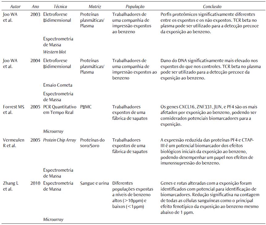 Oh et al.(123, empregaram proteoma total de urina para a análise de eletroforese bidimensional combinada com LC-MS/MS; Joo et al.120), (122 identificaram que TCR beta no plasma pode ser utilizado para a detecção precoce da exposição ao benzeno; Forrest et al.124 e Vermeulen et al.125 identificaram, respectivamente, genes e proteínas mais afetados por exposição ao benzeno, podendo ser considerados potenciais biomarcadores; Zhang et al.120 avaliaram exposição ao benzeno em concentrações altas (>10 ppm) e baixas (<1 ppm) empregando Espectrometria de Massa e Microarray em sangue e urina. Estes autores identificaram redução significativa na contagem de todas as células sanguíneas na exposição ao benzeno mesmo abaixo de 1 ppm e na formação de colônias progenitoras de células-tronco da medula óssea; sendo as células progenitoras mais sensíveis aos efeitos de benzeno do que as células sanguíneas maduras, a exposição é tida como provável causa da hematotoxicidade observada120.