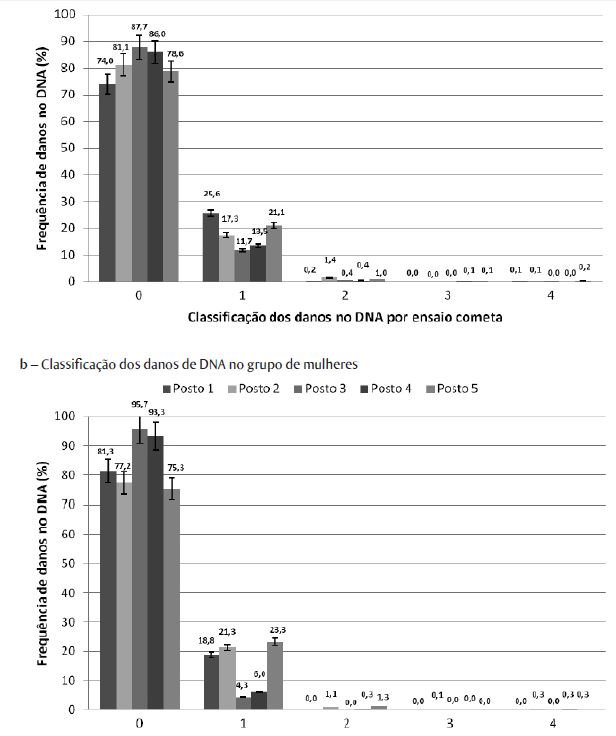 É possível observar, tanto no grupo de homens (Figura 1a) quanto no grupo de mulheres (Figura 1b), um aumento da classificação do dano 0 e uma diminuição da classificação do dano 1, ambos acentuados no Posto 3 e discrepantes dos Postos 1, 2 e 5. Com relação às enzimas do estresse oxidativo, apenas a CAT apresentou diferença significativa na comparação dos Postos 1 e 2 com os Postos 3, 4 e 5, no grupo masculino. No grupo feminino, essa diferença se mantém entre o Posto 3 e os postos 1, 4 e 5. Para o total da população, ou seja, juntando-se os grupos masculino e feminino, essa diferença entre os Postos permanece somente na comparação entre o Posto 2 com os Postos 3, 4 e 5.