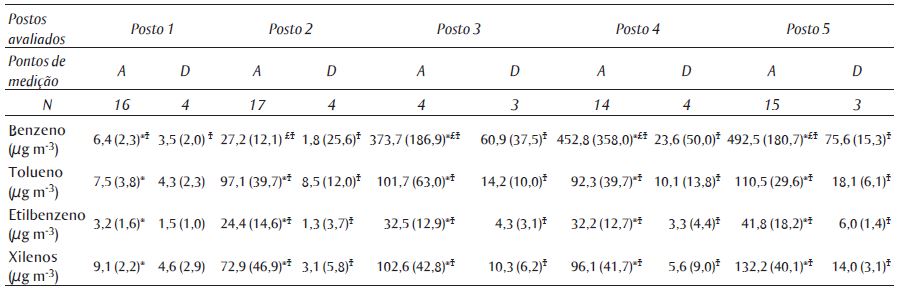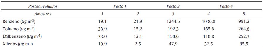 Participaram do estudo 97 trabalhadores oriundos de 5 postos de combustíveis localizados nos bairros de Bonsucesso, São Cristóvão, Tijuca, Vila Isabel e Lins de Vasconcelos, selecionados das RA VII, VIII, IX, X e XIII do município do Rio de Janeiro. Os resultados da avaliação ambiental, que correspondem às concentrações de BTEX nas amostras de ar coletadas nos cinco postos de combustíveis, são apresentados na Tabela 1 em ordem crescente de concentração do benzeno.