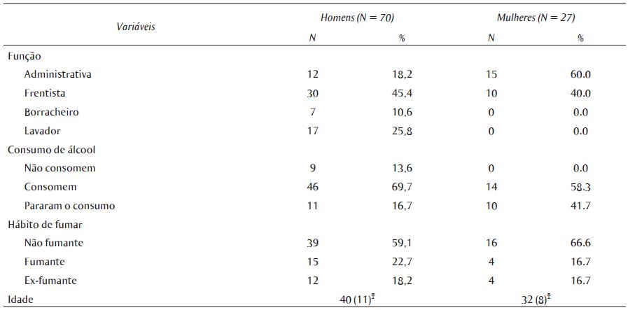 As características sociodemográficas são apresentadas na Tabela 3. A amostra do estudo foi composta por 72% de homens e 28% de mulheres, com idade média de 40 e 32 anos, respectivamente, não havendo diferença estatística por meio do teste t de Student. A maior parte da população foi composta por frentistas (45,4% homens e 40,0% mulheres). A maioria dos entrevistados relatou fazer uso de bebida alcoólica (69,7% dos homens e 58,3% das mulheres) e não fumar (59,1% dos homens e 66,6% das mulheres). Não foi relatada a utilização de nenhum equipamento de proteção individual ou coletiva durante a jornada de trabalho, inclusive durante o recebimento de combustíveis e os testes de qualidade, atividades de maior exposição.
