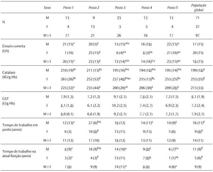 Os resultados das análises biológicas (ensaio cometa, CAT e GST) e dados ocupacionais (tempo de trabalho em postos de combustíveis e tempo de trabalho na atual função) foram comparados entre os diferentes postos de combustíveis e são apresentados na Tabela 4.