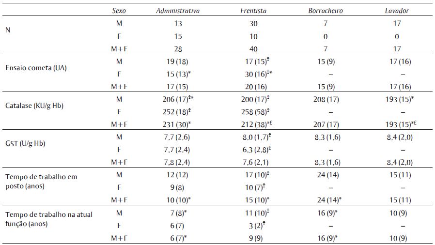 A função de trabalho de frentista apresentou diferença entre os grupos masculino e feminino para todos os indicadores biológicos e dados ocupacionais. A atividade enzimática da CAT também apresentou diferenças estatísticas entre os sexos na função administrativa. Além disso, as funções de trabalho foram comparadas com relação ao sexo separadamente. Dos indicadores biológicos, o ensaio cometa apresentou diferença entre as funções administrativa e frentista no grupo feminino; a CAT, entre as funções administrativa e lavador no grupo masculino. Entretanto, para o conjunto total da população de homens e mulheres, somente a CAT apresentou diferença entre a função administrativa e as funções de frentista e lavador, e entre as funções frentista e lavador. Dos dados ocupacionais, o tempo de trabalho na atual função apresentou diferença entre as funções administrativa e borracheiro somente no grupo masculino. Essa diferença se mantém quando agrupados os trabalhadores homens e mulheres. Além disso, o total da população também apresentou diferença nas médias de tempo de trabalho em postos de combustíveis entre a função administrativa e as funções frentista e borracheiro.