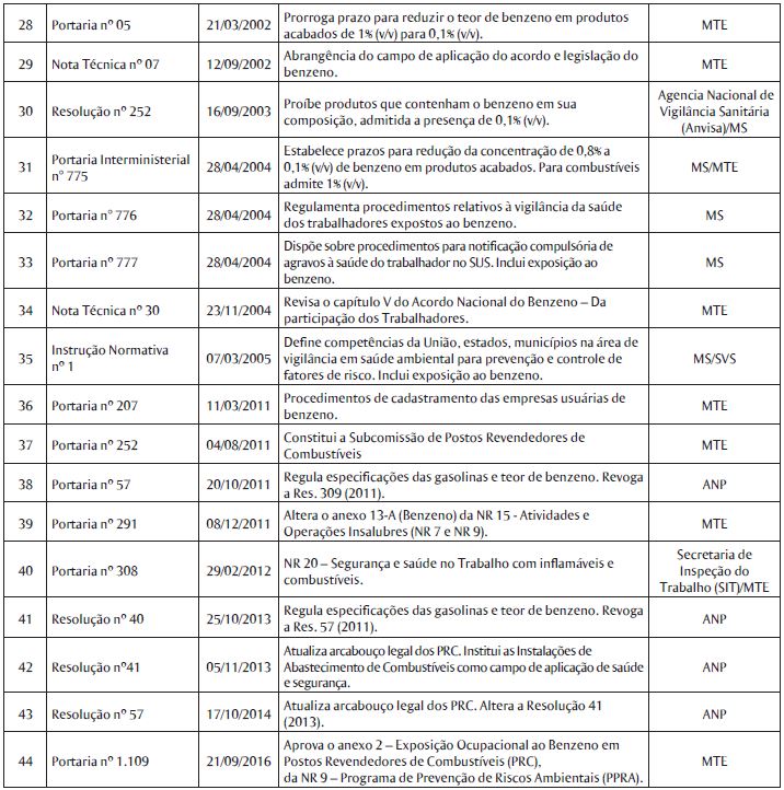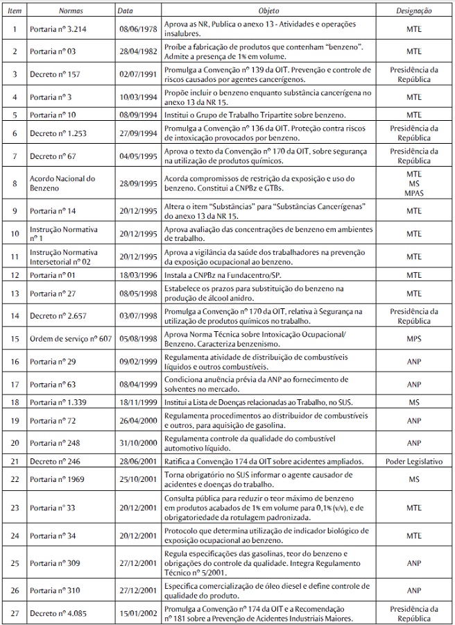 No Brasil, o marco legal que consolida o movimento pelo controle da exposição ao benzeno ocorreu principalmente na década de 1990, tornando-se basilar às demais normas aprovadas nos anos subsequentes. O Quadro 1 apresenta o marco normativo relacionado à exposição ao benzeno, que reflete a evolução das medidas legais no país. Neste período, ações de fiscalizações e estudos6), (7 evidenciaram importantes revelações de intoxicação por benzeno, que subsidiaram a elaboração dessas normas.