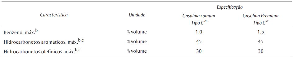 A gasolina é um derivado do petróleo que contêm hidrocarbonetos alifáticos e aromáticos, dos quais um dos compostos é o benzeno, com a concentração de até 1%, e por isso é uma importante fonte de exposição ocupacional e ambiental. A expansão da frota de veículos automotivos e do consumo de gasolina nos centros urbanos aumenta a magnitude dessa exposição. Estima-se que, por meio das emissões dos veículos automotores, as concentrações desse poluente no ar podem alcançar 100 ppb nos centros urbanos com elevado tráfego12), (13. No Brasil, a Agência Nacional do Petróleo (ANP) estabeleceu, por meio da Resolução nº 40, de 25 de outubro de 201314, atualização quanto às especificações das gasolinas para a comercialização e as obrigações dos agentes econômicos sobre o controle da qualidade do produto. No entanto, a partir da produção de gasolinas aditivadas com maior octanagem, a quantidade de benzeno presente é maior em relação aos outros tipos de gasolina. Dessa forma, a ANP, por meio desse regulamento técnico, determinou o valor máximo de concentração de benzeno de 1% (v/v), na gasolina do tipo C ou Premium tipo C, e também dos teores para outros hidrocarbonetos aromáticos e olefínicos presentes na gasolina (Tabela 1).