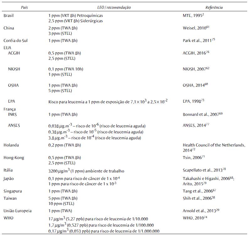Considerando os limites adotados por vários países para exposição ao benzeno, as variações são poucas. Geralmente, o LEO considera uma exposição durante 8 horas por dia, para uma semana de trabalho de 40 horas, e corresponde à média ponderada no tempo da exposição. Diferentes limites são preconizados por agências governamentais e não governamentais dos diversos países, denominados de distintas maneiras como TLV (Threshold Limit Values - ACGIH/EUA), PEL (Permissible Exposure Limits - OSHA/EUA), OELV (Occupational Exposure Limits Value - SCOEL (Scientific Committee on Occupational Exposure Limits)/União Europeia) e WEL (Workplace Exposure Limits - HSE (Health and Safety Executive)/Reino Unido). O TLV-STEL (Short-Term Exposure Limit) indica o limite de concentração para exposições por um curto período de tempo, e o TLV-TWA (Time Weighted Average) está baseado na média ponderada no tempo, não podendo ser ultrapassados na jornada de trabalho. No Brasil, foi adotado o Valor de Referência Tecnológico (VRT), no lugar de um limite de tolerância biológica, assumindo legalmente que, mesmo estabelecendo um limite de benzeno no ar em termos de vigilância sanitária, não se excluiu o risco à saúde8. Essa abordagem foi assumida no Brasil, a exemplo da experiência alemã, à época em que foi firmado o acordo do benzeno, e que atualmente passou a assumir uma nova estratégia de LEO57.