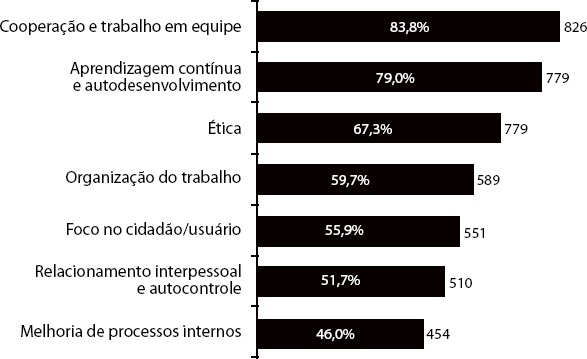 Nesse sentido, temos os resultados do mapeamento das sete competências que melhor traduzem a estratégia, a missão, a visão e os valores do Tribunal e que foram escolhidas por 986 magistrados e servidores, representando 22% do TRT estudado, através de consulta realizada pela Secretaria de Desenvolvimento de Pessoas, em 2015 (Figura 1).