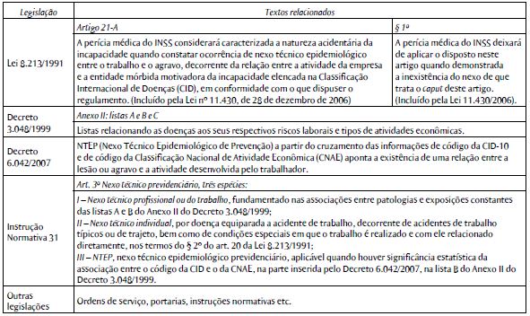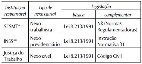 Results: three types of legal causal nexus were identified: job-related, by the Specialized Services in Safety Engineering and Occupational Medicine (SESMT); social security, by the National Institute of Social Security (INSS); and civil law, by the Labor Court. Law No. 8,213/1991 is the common reference for the three mentioned institutions; other normative legal acts are specific within each institution: the Occupational Regulatory Standards (SESMT); the Normative Instruction 31 (INSS), and the Civil Code (Labor Court).