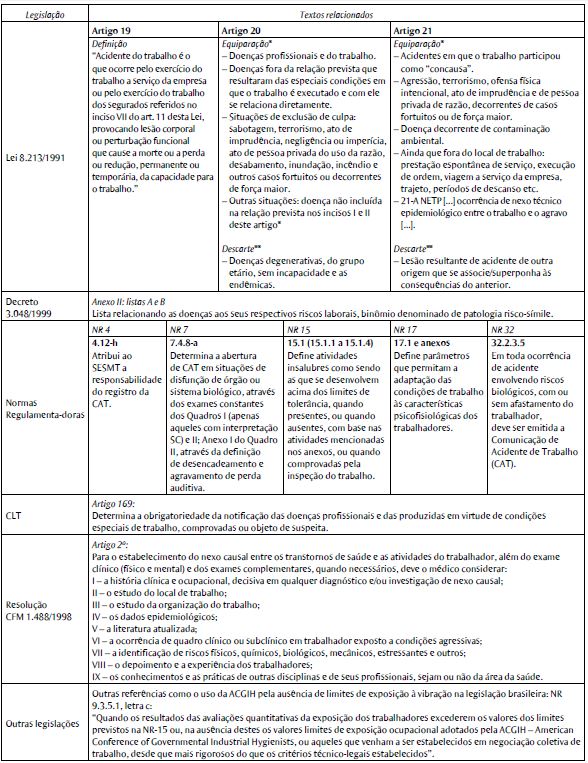 Conclusão: o uso correto da legislação facilita o estabelecimento do elo entre o acidente e o trabalho, auxiliando na sua compreensão, padronização, diminuição de conflitos e aumento da notificação.