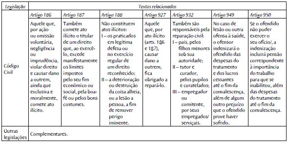 A Justiça do Trabalho (Quadro 4) é competente na apreciação e no julgamento das demandas de indenização por dano moral ou patrimonial originados da relação de trabalho16. Baseia sua análise no Código Civil11, conforme os artigos 186, 187, 188, 927, 932, 949 e 950, que estabelecem a obrigatoriedade em reparar danos ilícitos causados a outrem. A sua conclusão final é a sentença judicial procedente ou improcedente, ou seja, se conclui pelo nexo negativo, a sentença resultará em improcedente, ou, ao contrário, se conclui nexo causal positivo a sentença, resultará em procedente, arbitrando uma indenização de valor variado (quantum indenizatório).
