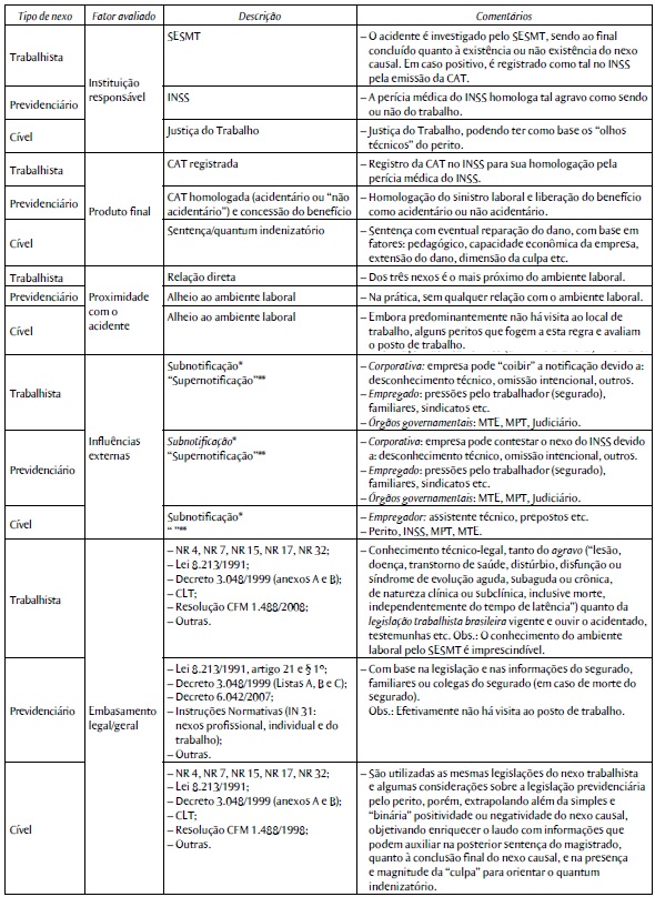 Com base na comparação entre os nexos trabalhista, previdenciário e cível, como já mencionado, busca-se neste ensaio apontar as semelhanças e evidenciar as diferenças entre eles, assim como estudar os fatores que determinam essas diferenças e que caracterizam cada um dos três nexos como entidade única e bem definida. Esses fatores que caracterizam os três nexos determinam as razões pelas quais podem às vezes ser coincidentes, concordantes, complementares ou mesmo destoarem frontalmente, visto que cada um é estabelecido por determinado ator social (SESMT, INSS ou Justiça do Trabalho) com uma respectiva legislação a ser seguida.