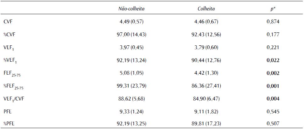 Os resultados deste estudo mostraram que, apesar dos valores espirométricos permanecerem dentro dos limites normais durante os dois períodos de avaliação, uma diminuição significativa foi observada em %FEF25-75%, %VEF1 e VEF1/CVF durante a época de colheita.