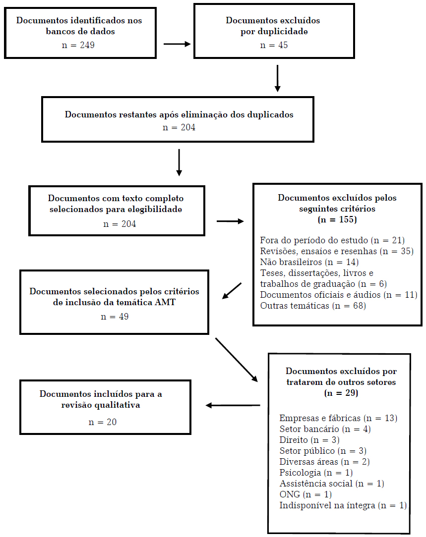 Na Figura 1 pode-se verificar o processo de seleção dos documentos avaliados. Dos 249 documentos inicialmente encontrados nas bases de dados, 20 foram selecionados.