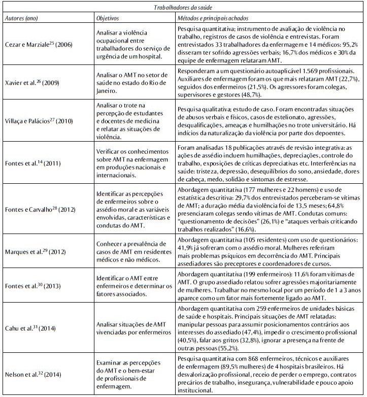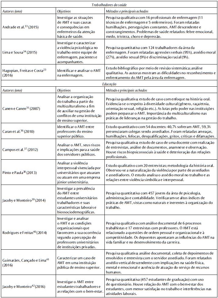 O objetivo do artigo de Andrade et al.33 foi analisar o assédio moral na perspectiva de 11 técnicos de enfermagem e 5 enfermeiros que trabalham em unidades de saúde da família. Há situações de humilhações e constrangimentos que causam depressão, medo, tristeza e episódios de febre. Um caso de assédio sexual foi relatado por uma trabalhadora que presenciou uma colega sendo assediada por um médico. O estudo não abarcou a organização e as condições de trabalho como subsídios para entender o AMT.