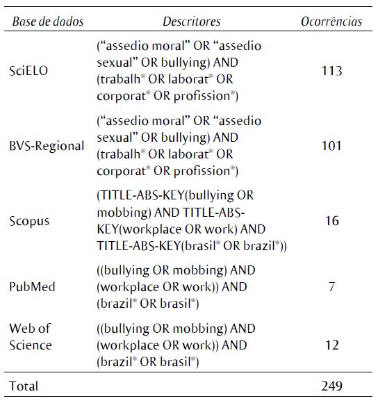 Na primeira etapa da pesquisa, em abril de 2017, os estudos foram buscados nas seguintes bases de dados: SciELO, BVS-Regional, PubMed, Scopus e Web of Science. Os descritores e as ocorrências estão descritos na Tabela 1.
