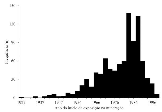 O ano de início da exposição à sílica se estendeu de 1927 a 1998, com predomínio na década de 1980 que concentrou 42,5% dos avaliados (Figura 1).